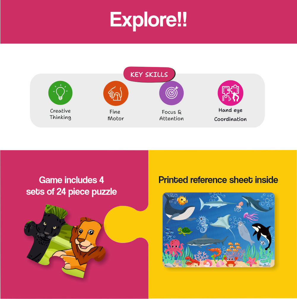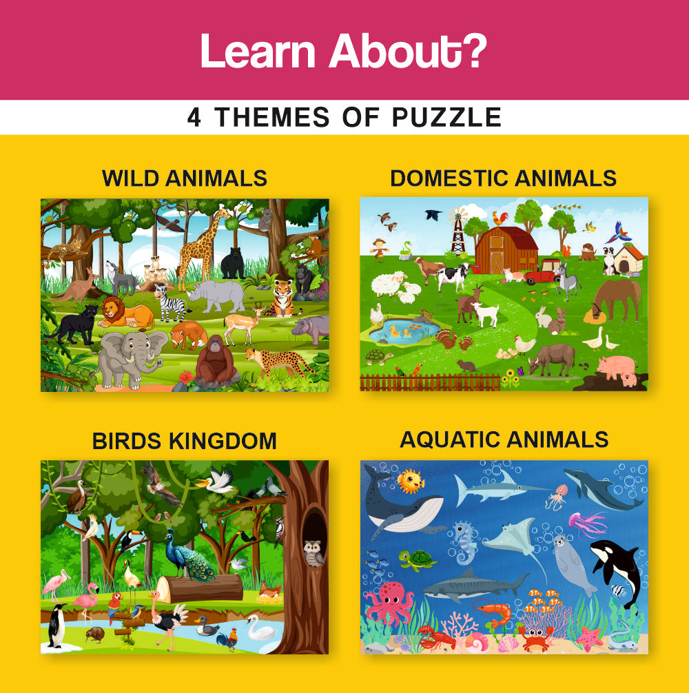 The Animal Kingdom Puzzle is a delightful educational game suitable for children aged 3 and up. The 24 piece puzzle has 4 puzzles which helps kids visually explore a variety of animals, birds, and aquatic creatures from around the world. Completing the puzzle encourages the development of creative thinking, fine motor skills, hand-eye coordination, focus, and attention - making it a smart an. . .