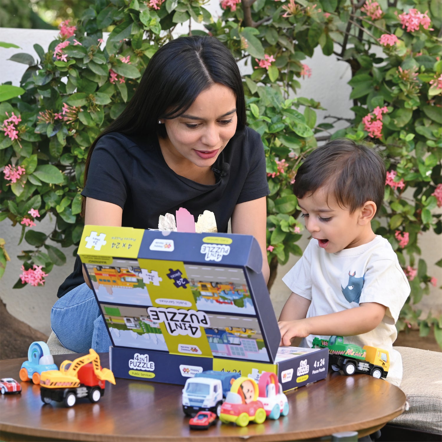 Show More >The Public Services Puzzle is a delightful educational game suitable for children aged 3 and up. The 24 piece puzzle has 4 puzzles which helps kids visually explore a variety of Public Transport, Public rules, Health & hygiene & Emergency Contact. Completing the puzzle encourages the development of creative thinking, fine motor skills, hand-eye coordination, focus, and attention - making it a smart and informative activity that's easy and kid-friendly.