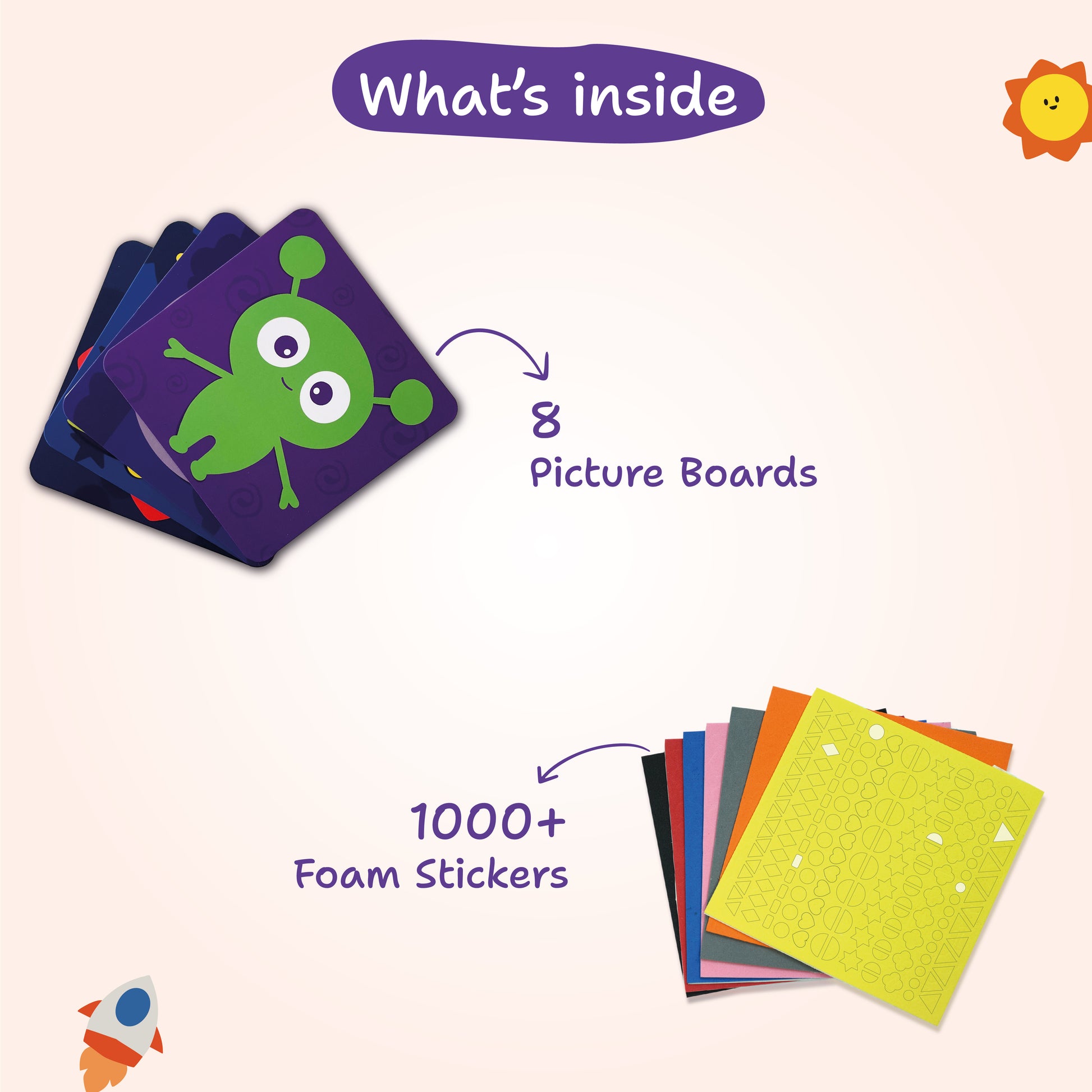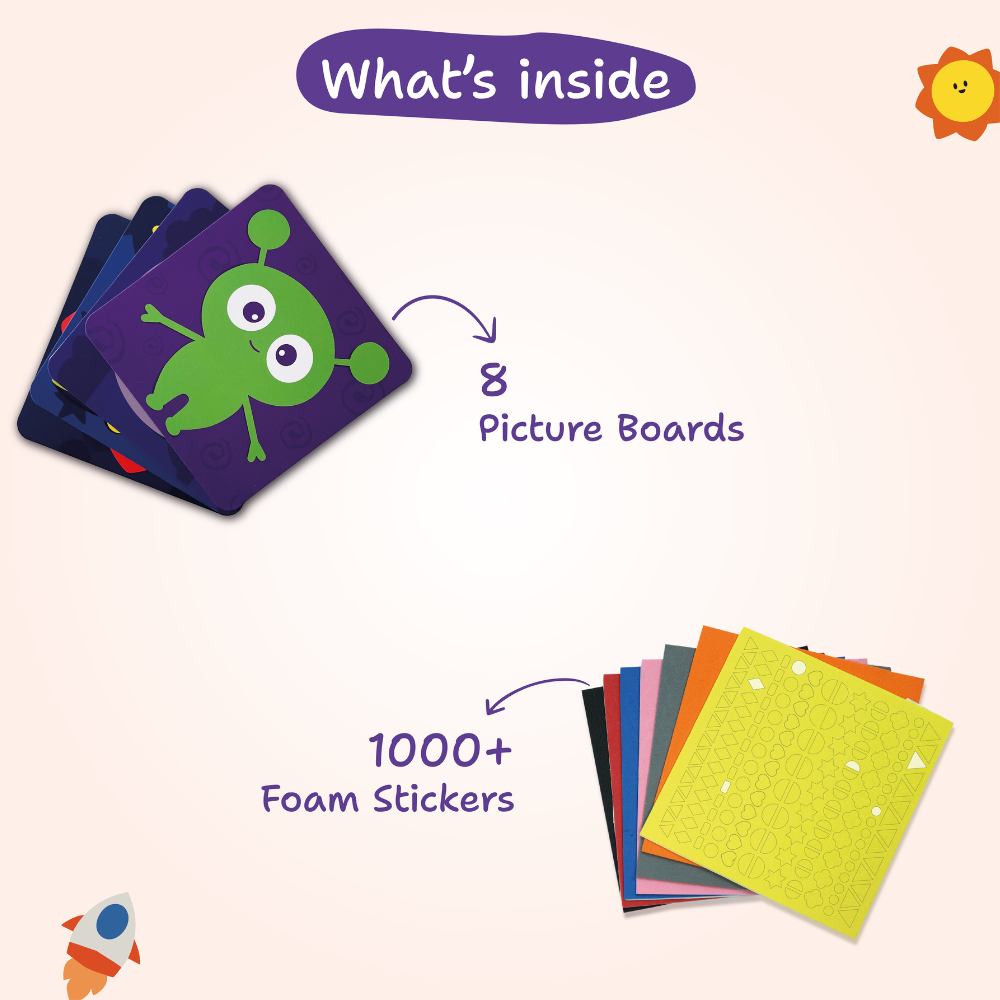 stickers to decorate vibrant, SPACE themed picture boards. Perfect for at-home fun or creativity on the go!