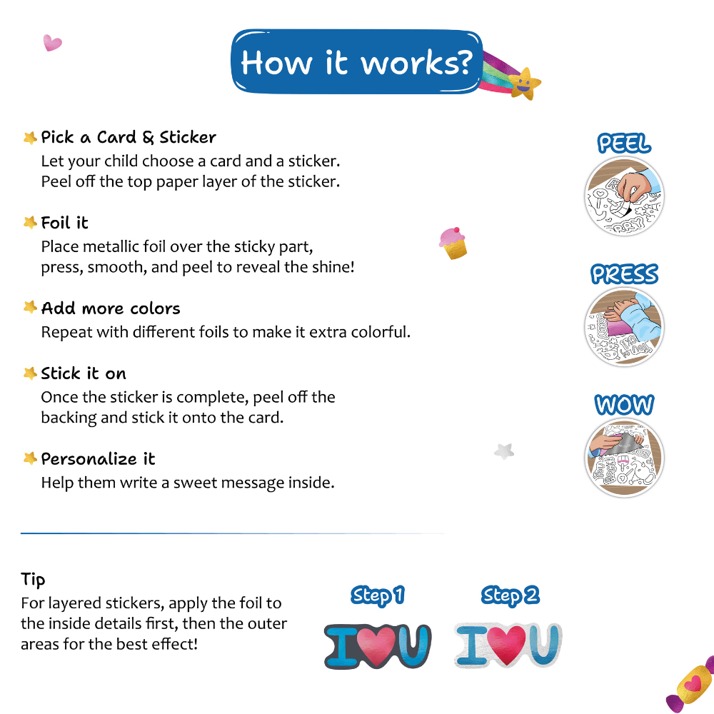 Just pick a card, decorate it with foam stickers, apply the shiny foil sheets, and reveal dazzling designs—it’s that easy and magical!