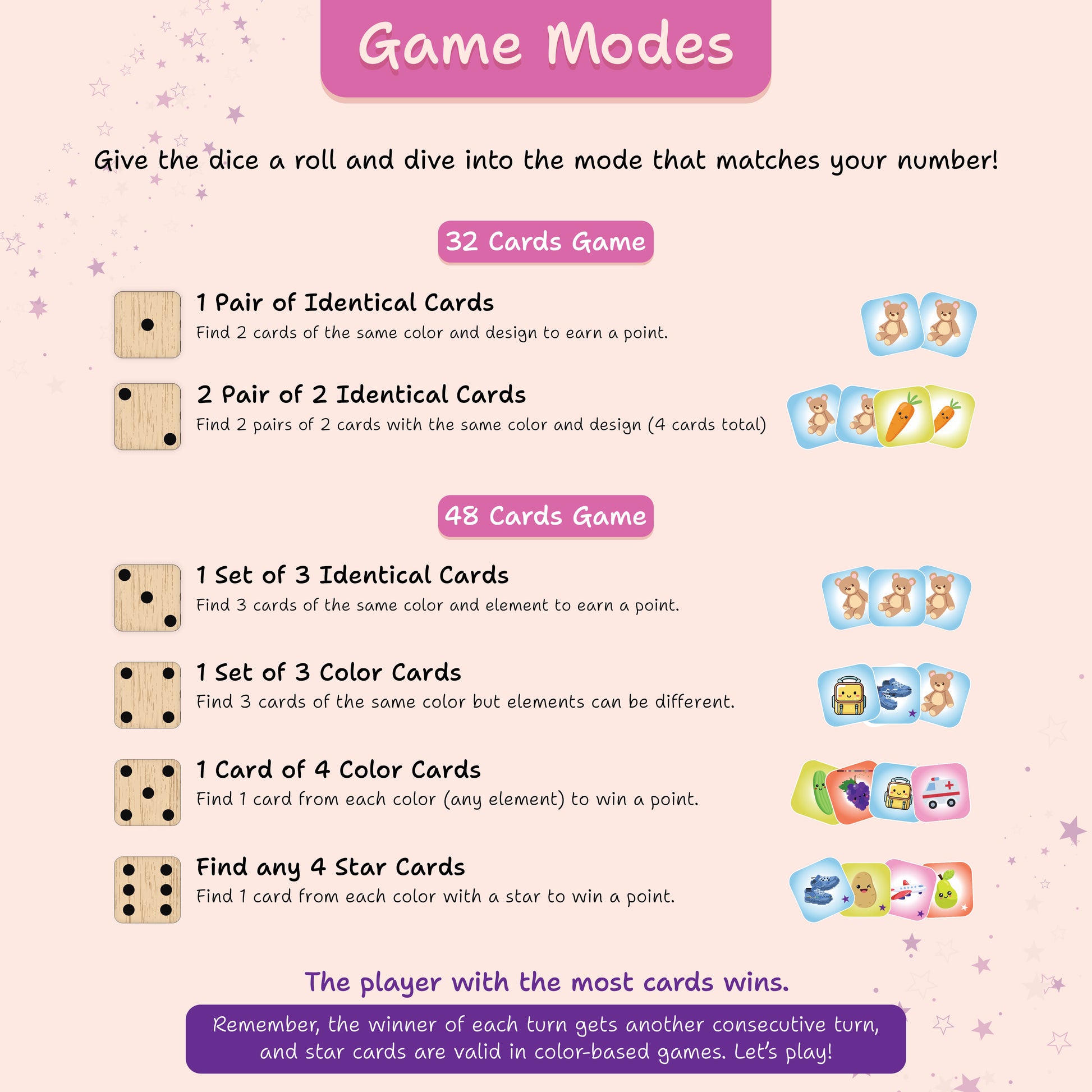 GET READY TO PLAY!This game is a group game can be played by 2-4 players.There are 3 sets of 16 cards of different themes on basis of colors: Fruits , Vegetables, Things & Vehicles. Let's roll the dice to determine the game mode. The game offers multiple ways to play:- 2 modes with 32 cards. 4 modes with 48 cards.Here's How to Set up:1. Stack cards by colour and pattern separa. . .