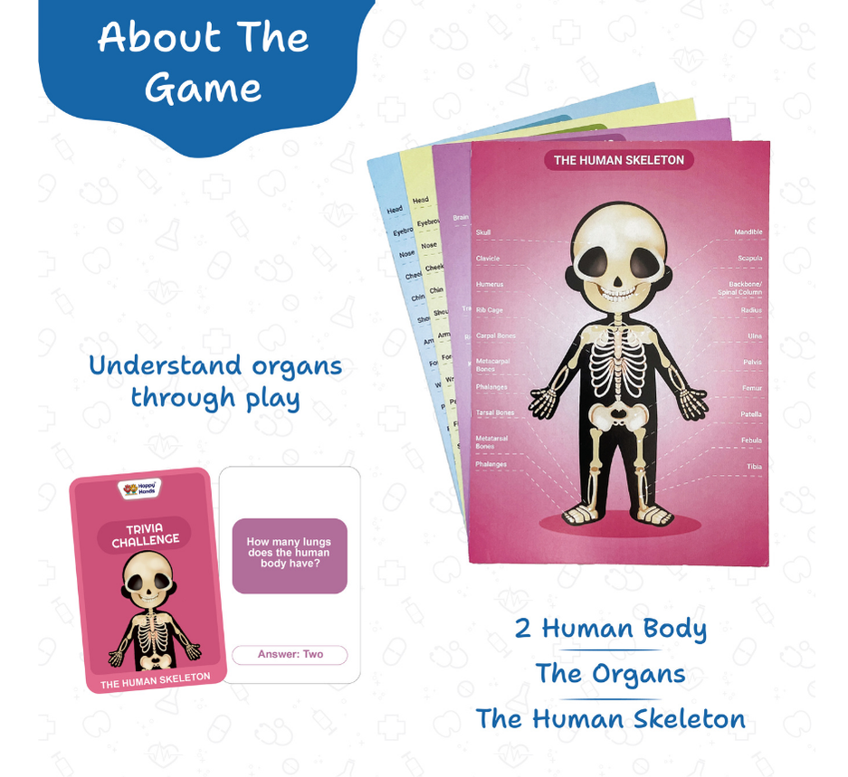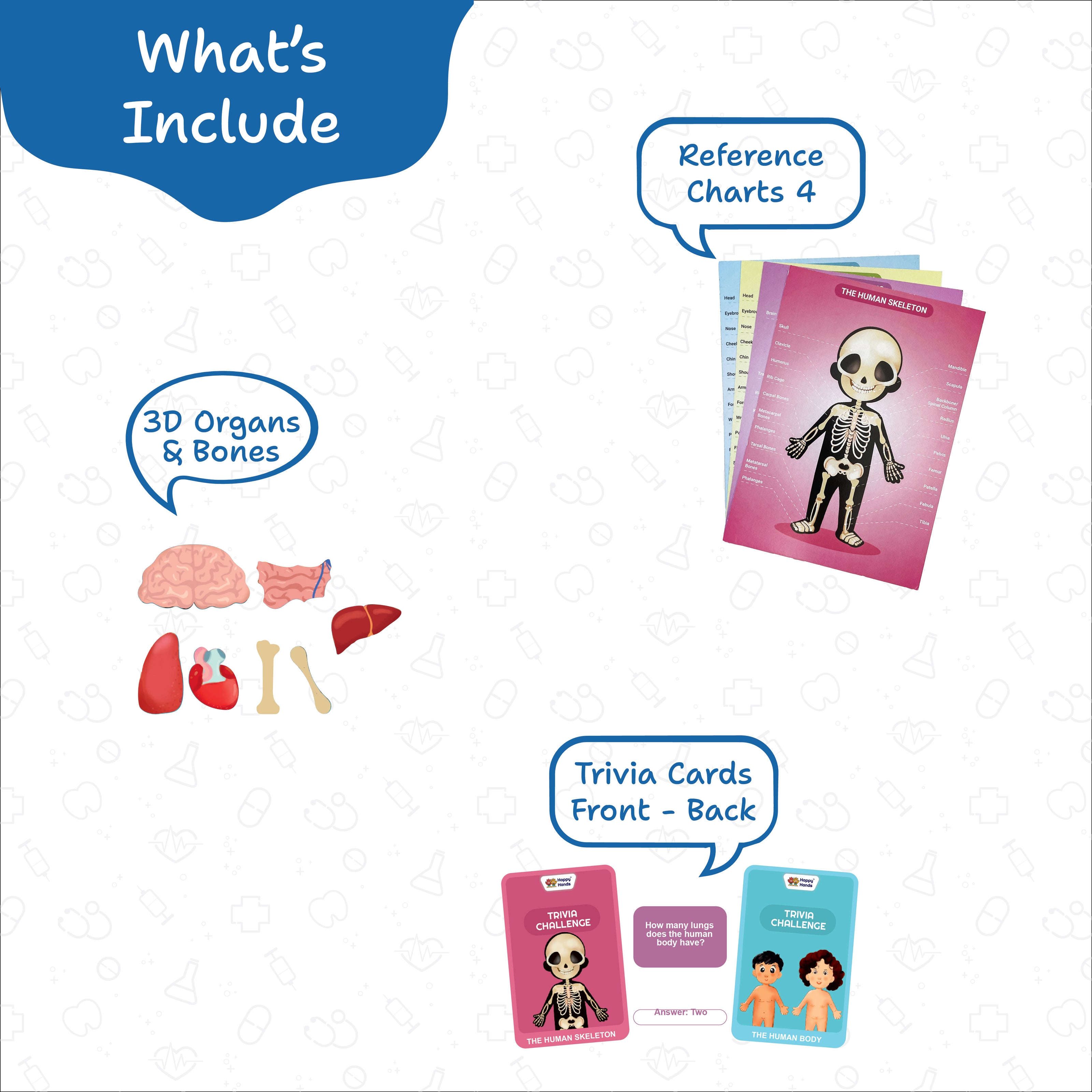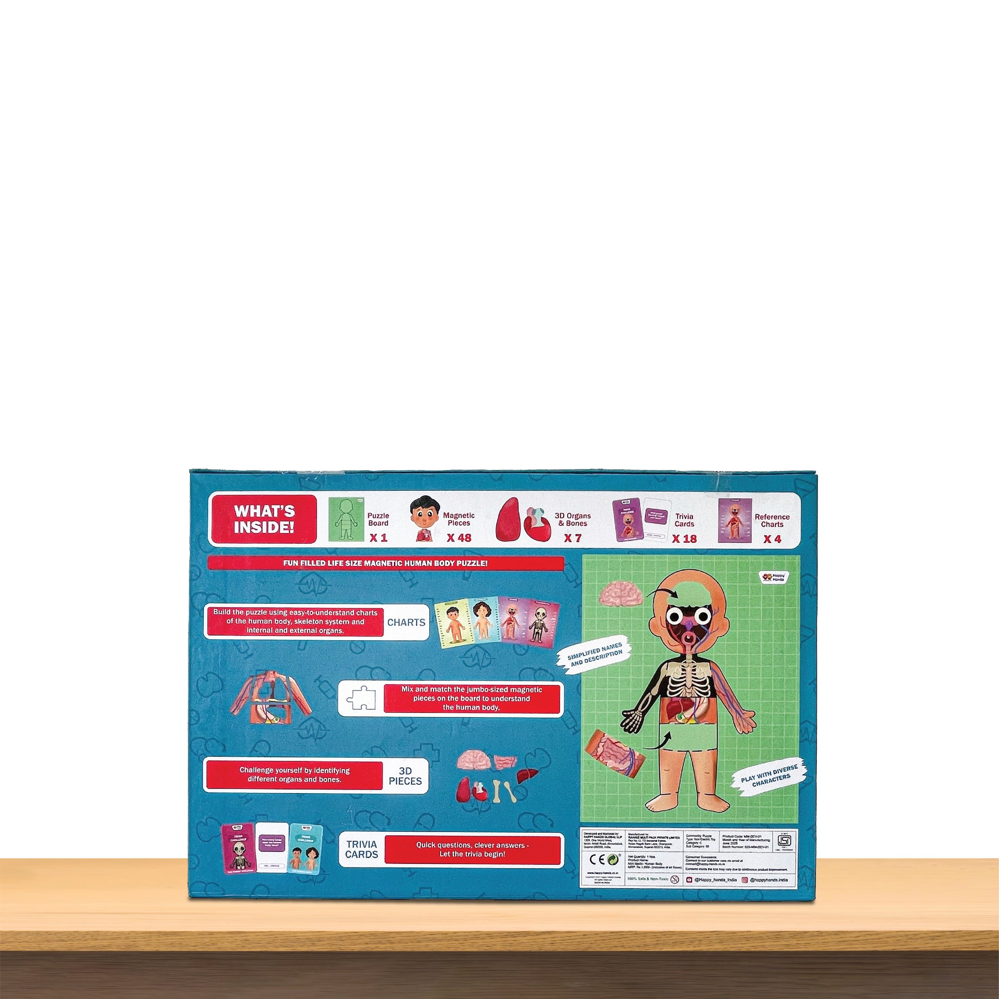Open the Magnetic Board. Use the 4 sets of human body puzzle sets given one at a time.Identify and learn the parts of the body using the chart given.Further challenge yourself with the given Trivia Cards. Additionally, you may mix and match the organ system and skeleton system to learn new concepts as well.