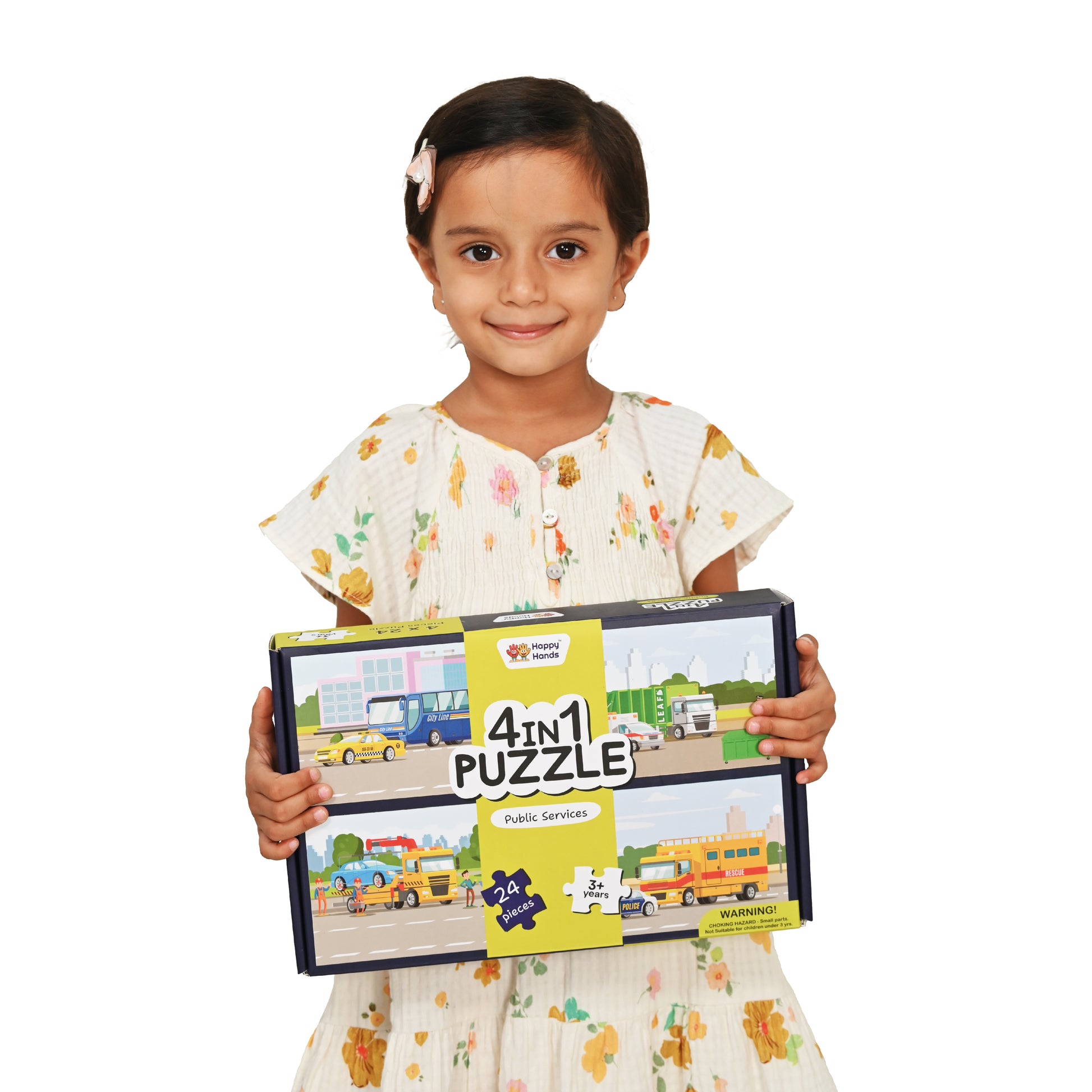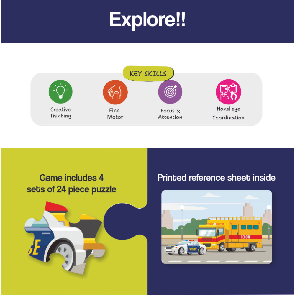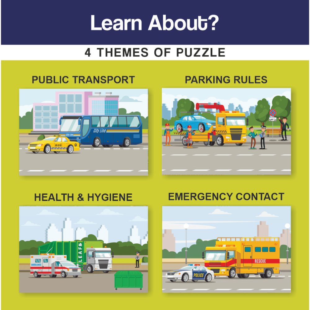 Show More >The Public Services Puzzle is a delightful educational game suitable for children aged 3 and up. The 24 piece puzzle has 4 puzzles which helps kids visually explore a variety of Public Transport, Public rules, Health & hygiene & Emergency Contact. Completing the puzzle encourages the development of creative thinking, fine motor skills, hand-eye coordination, focus, and attention - making it a smart and informative activity that's easy and kid-friendly.