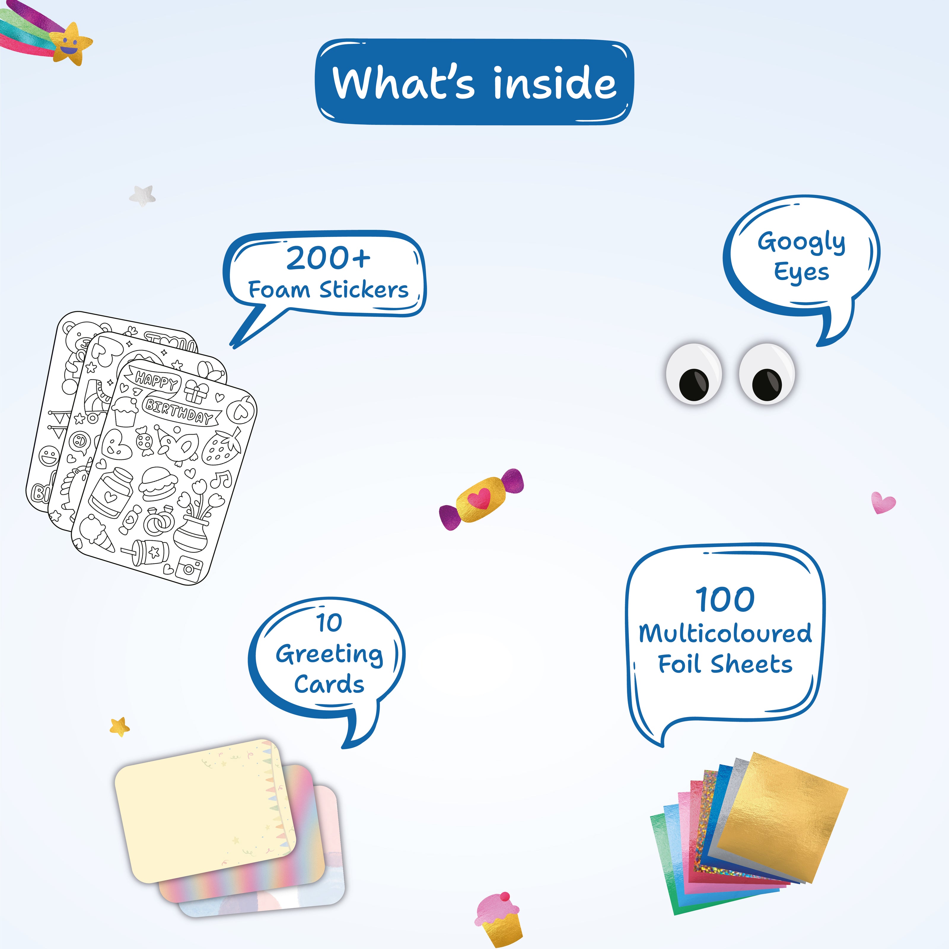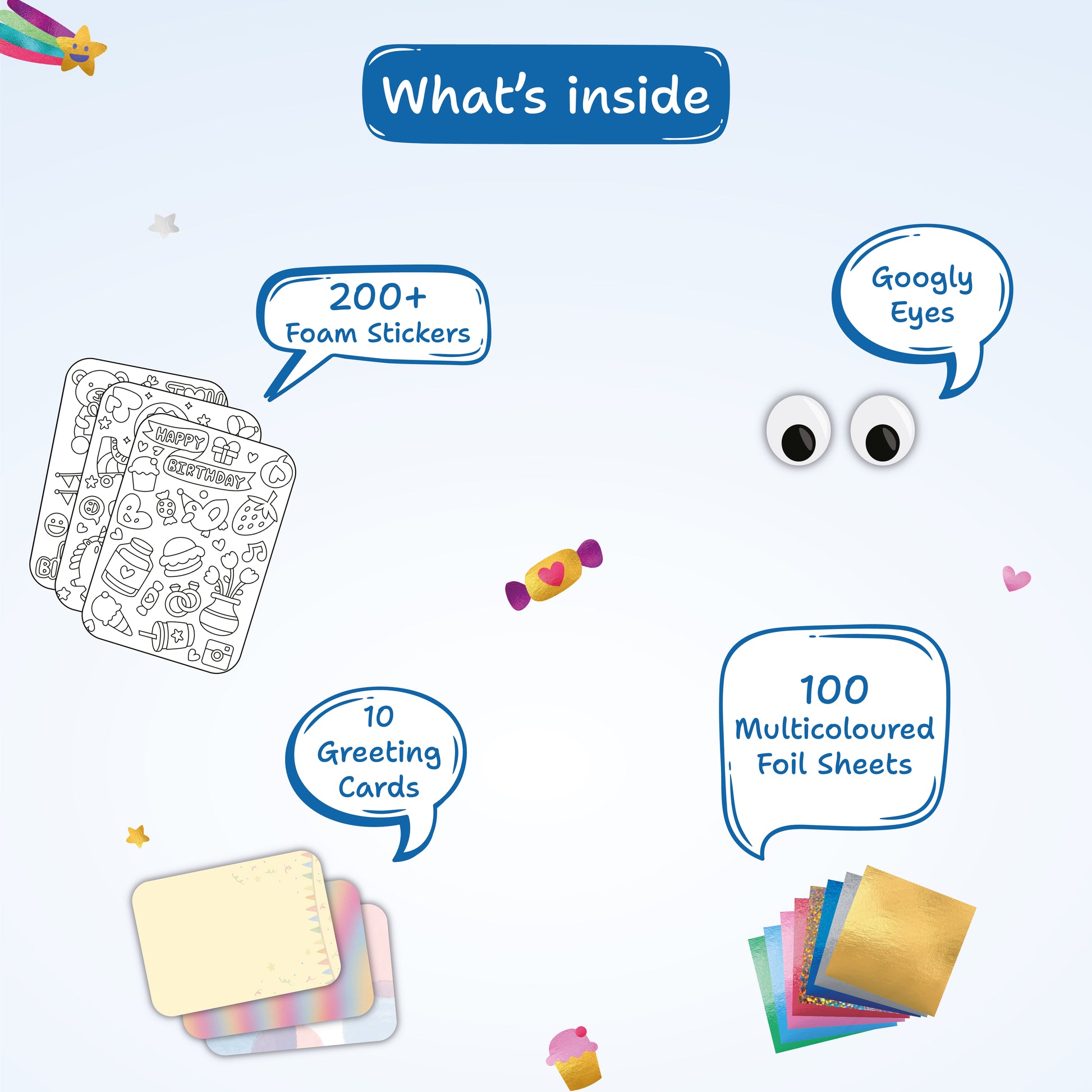 Over 400 foam stickers, 100 vibrant foil sheets, 10 greeting cards, googly eyes, and a step-by-step instruction manual.